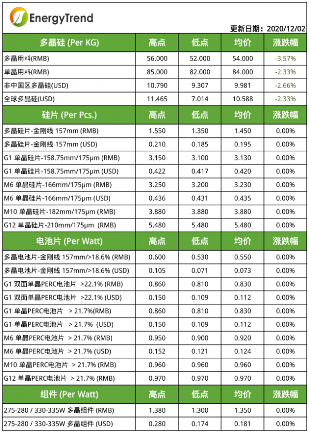 多晶硅片方面,受下游需求长时间疲软影响,本周价格弱势维稳。多晶企业持续低产,国内均价继续维持在1.45元/片,海外价格弱势持稳在0.195美元/片左右。另一方面,目前市场上大硅片产品逐渐放量,EnergyTrend本周增加M10和G12硅片报价,其中M10硅片均价在3.88元/片,G12硅片均价在5.48元/片。随着大硅片市场一线企业纷纷签订2021年度或数年长期订单,预期在本轮硅片产线改造升级和新建产能陆续释放,将加速市场需求疲软、经济性不足的弱势硅片产能退场。